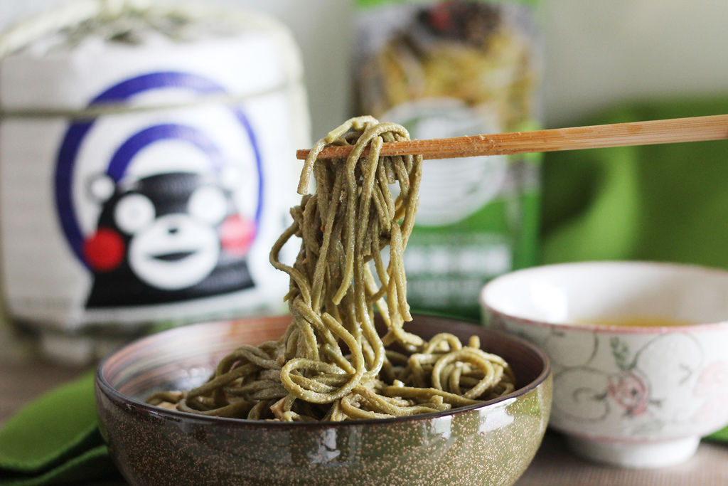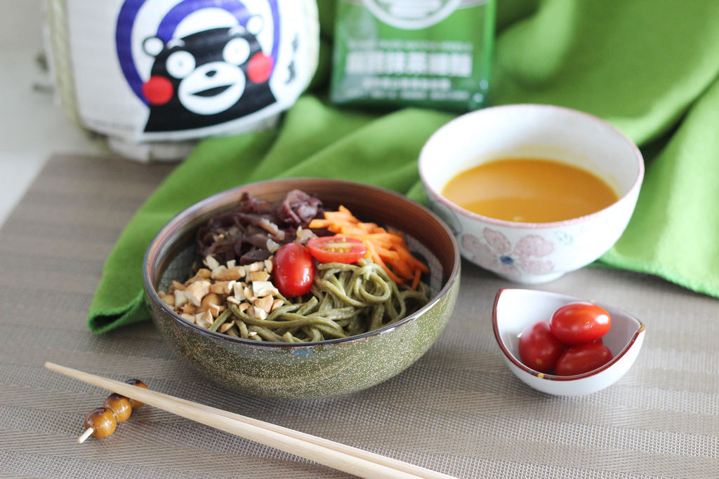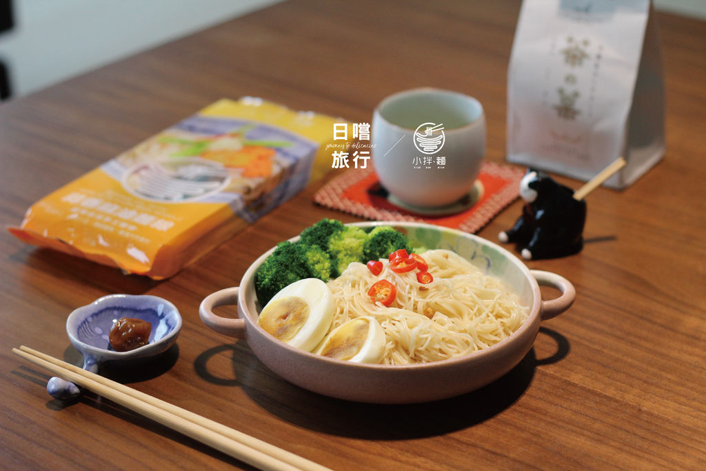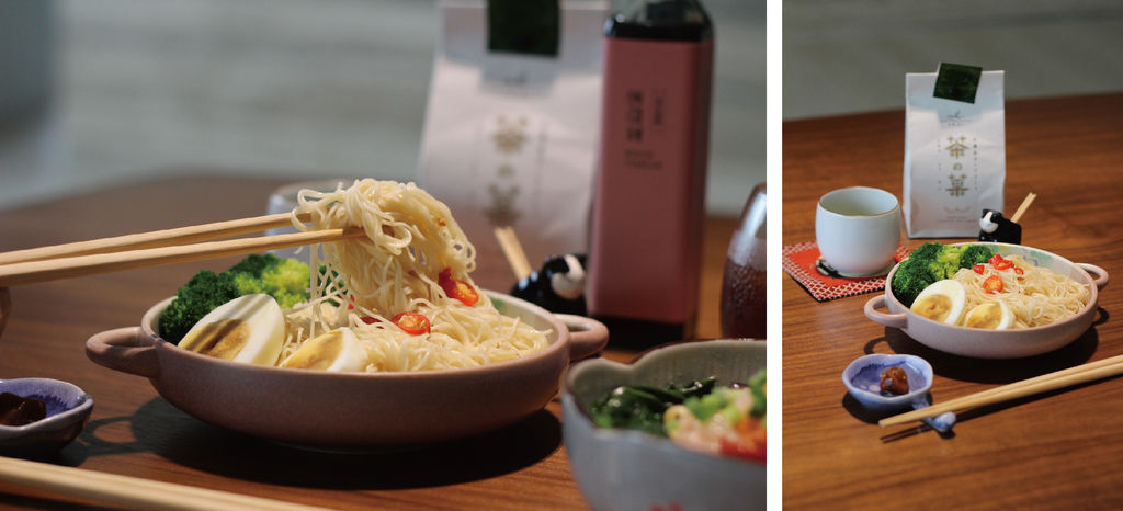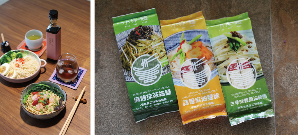 抹茶細麵是將抹茶粉揉入手工日曬的關廟細麵,煮熟後的麵體有淡淡茶香,口感也有勁兒不會軟爛