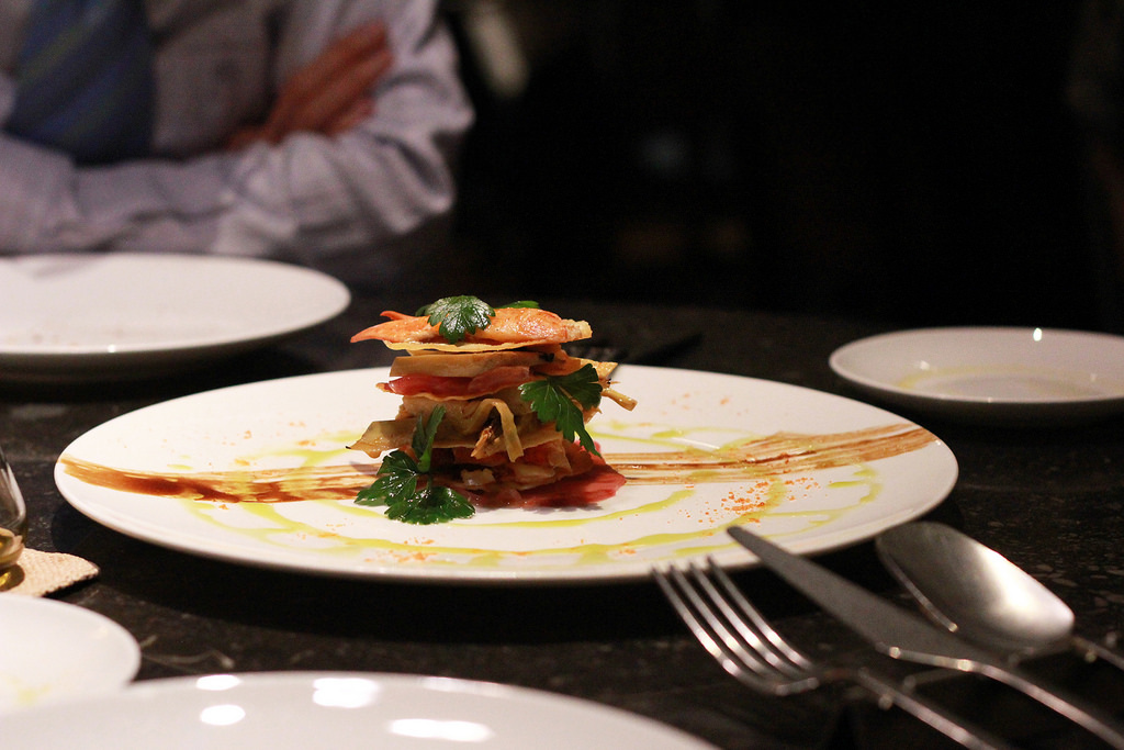 以薩丁尼亞島的香脆薄餅一層層疊起的海鮮蛋糕