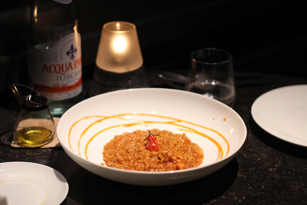 使用大量的胭脂蝦為燉飯上色提味,醬汁收得很乾、蝦味相當濃厚